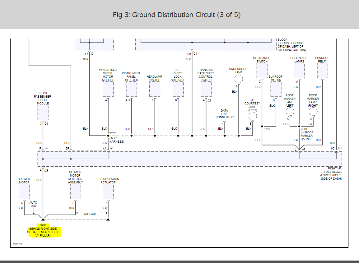 This could be a problem with ground #200 which is located behind the right side of the dash near the "A" pillar. Today's modern vehicles have a lot of electronics and electrical systems on them. People tend to focus on the power side of circuits but forget that it is only 1/2 of the circuit. The ground side of the circuit is the other half. In fact 75% of all vehicle electrical problems are poor or bad grounds. Because of the many electrical circuits in today's vehicles, they will share a common ground, so if the ground goes bad, it will effect many systems. In the diagrams down below I have included a ground distribution wiring diagram for your vehicle as well as ground location and how to inspect a ground for your vehicle. Please go through these guides and get back to us with what you are able to find out.