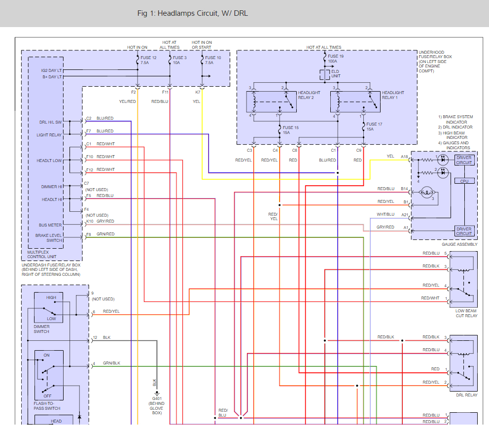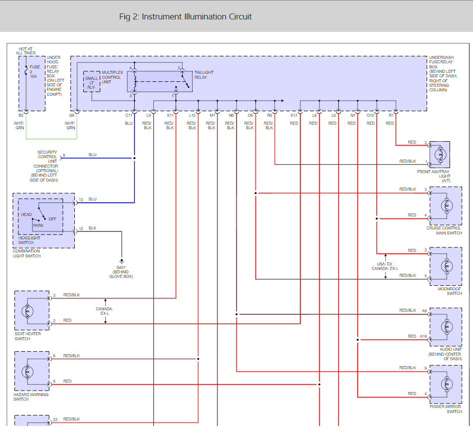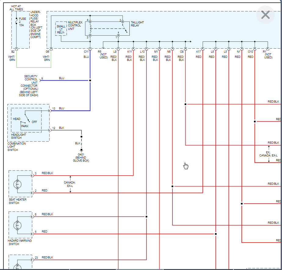 Under dash fuses were all over the place. Unless I'm not understanding this, I used the circuit tester and 1,4,6,8,9,10,12,13,14,17,18,19,20,23,24 were all unlit. Only a handful lit up the light. This makes no sense to me since a lot of those fuses power things like the ignition coil, radio power, key-less receiver unit, power windows, etc. And those all work! what the heck am I missing? The wiring diagram you listed has the headlight switch connecting to the main circuit which feeds down into things like the heater controls and such. But there's no relay on the board for that. where is this relay? Or is that actually the headlight switch knob? and If so, how the heck do i test that?