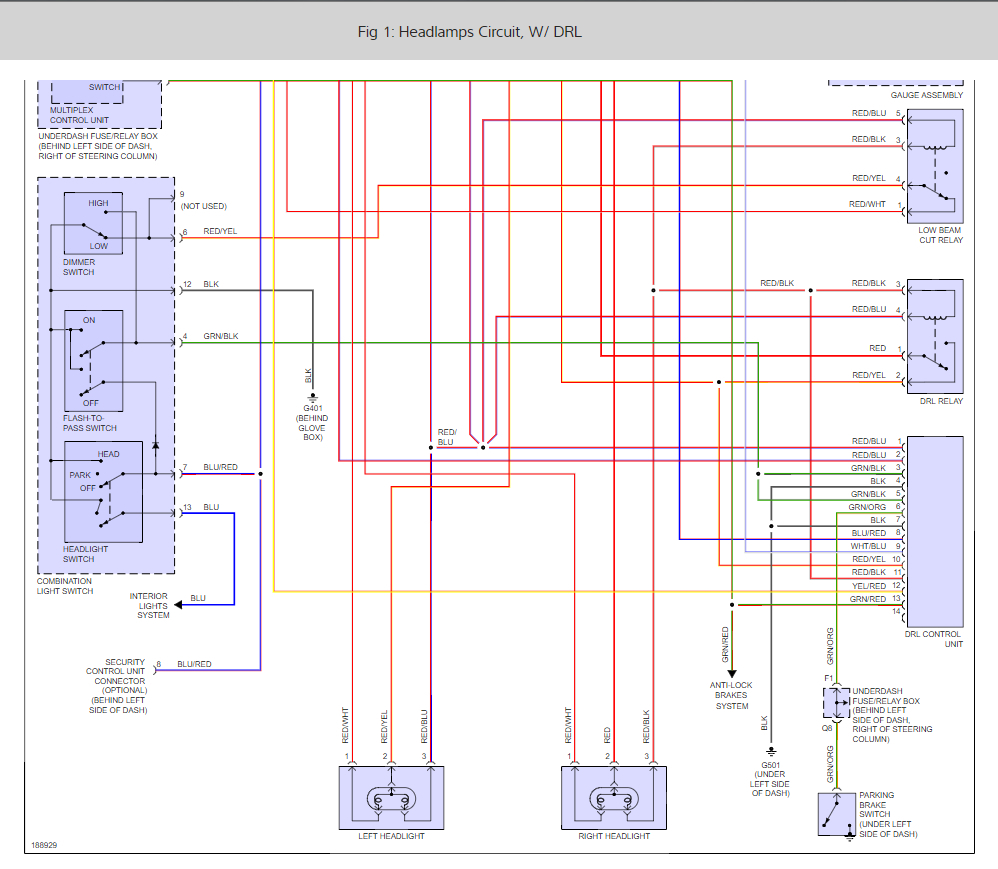 So by reading that diagram, as well as the fuse charts I've seen, I'm assuming the Headlight switch relay (since everything stops working once the switch is clicked on). I'm not clearly seeing which one that is. Also I'll note than when switching from parking lights to full headlights the "D" and "OD Off" lights flicker quickly.
