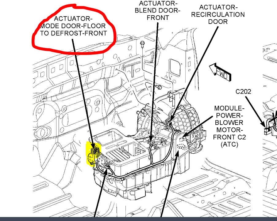 Before just replacing the actuator, see if it moves when you adjust from floor to defrost. If it doesn't, replace it. Also, I hope I understood your post. At first you said there is no air flow through the defroster, but later in the post it almost seemed to be only temperature related. The directions are for air flow and not temp, so if I am wrong, let me know.