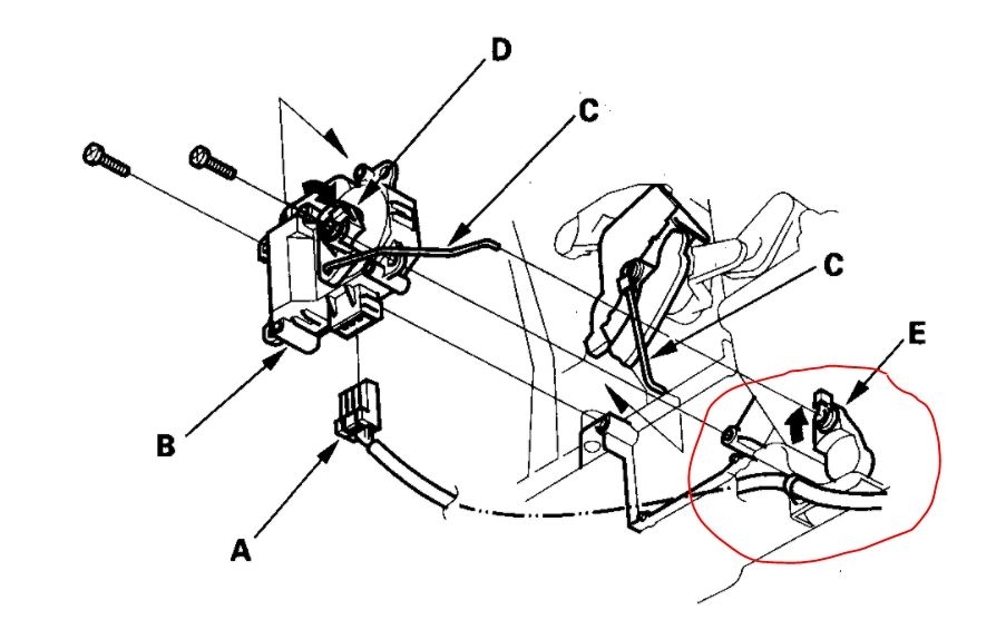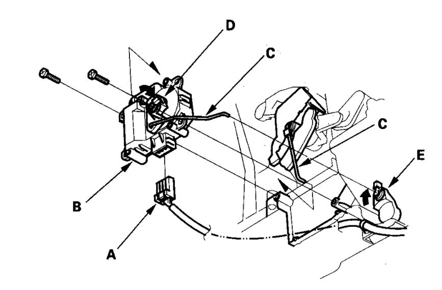 1. Disconnect the 7P connector (A) from the front mode control motor (B). Remove the rods (C) of the front mode control motor from the front mode control motor linkage (D) and the front mode control linkage (E). Remove the self-tapping screws and the front mode control motor from the heater unit.