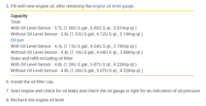 W/Oil filter change: 4.01 (4.23 U.S. quarts, 3.52 Imp quarts)
