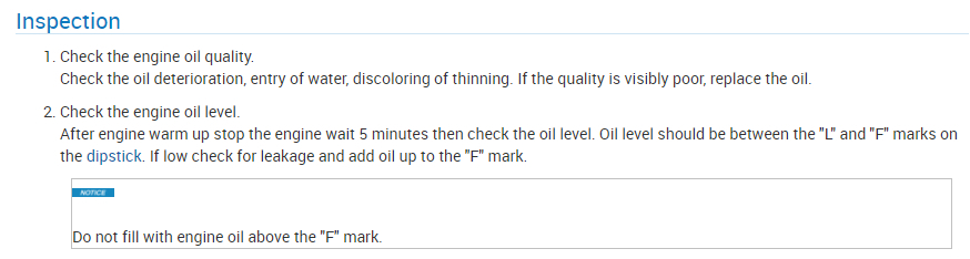 After warming up the engine and then 5 minutes after the engine stop, oil level should be between the L" and " F" marks on the dipstick.