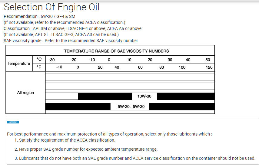 If 5W-20 engine oil is not available, secondary recommended engine oil can be used for the corresponding temperature range.