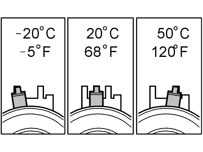 At higher temperatures, for example with engine at operating temperature or at higher ambient temperature, the needle is further to the right.