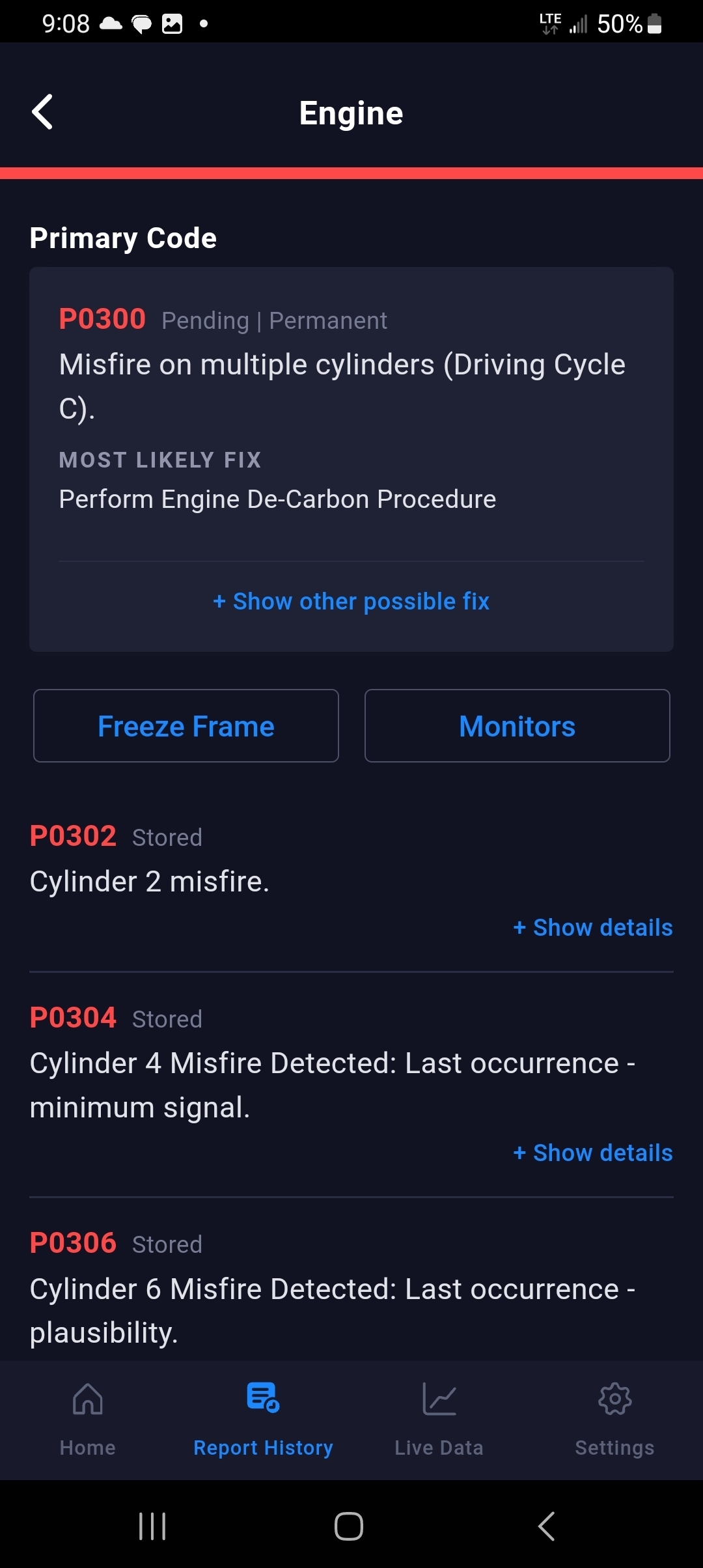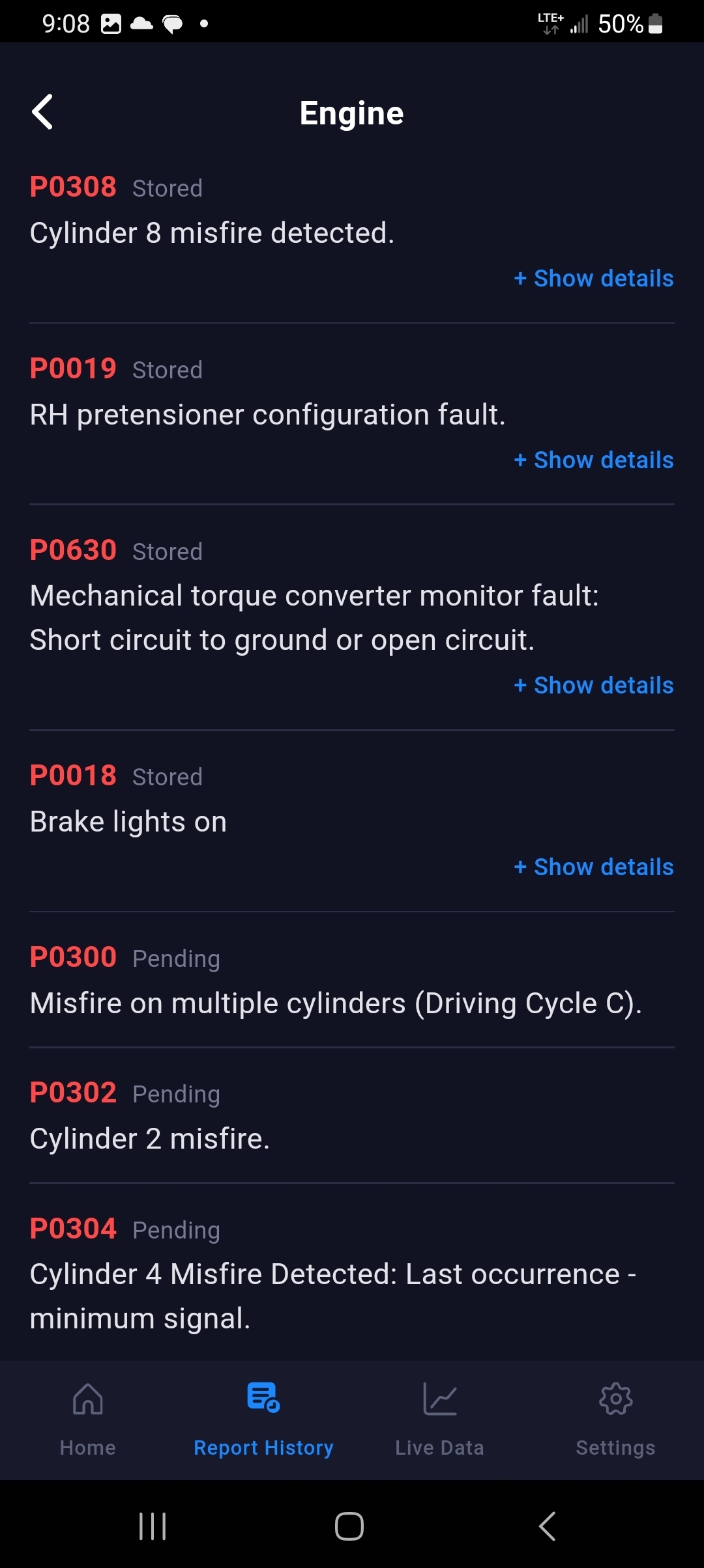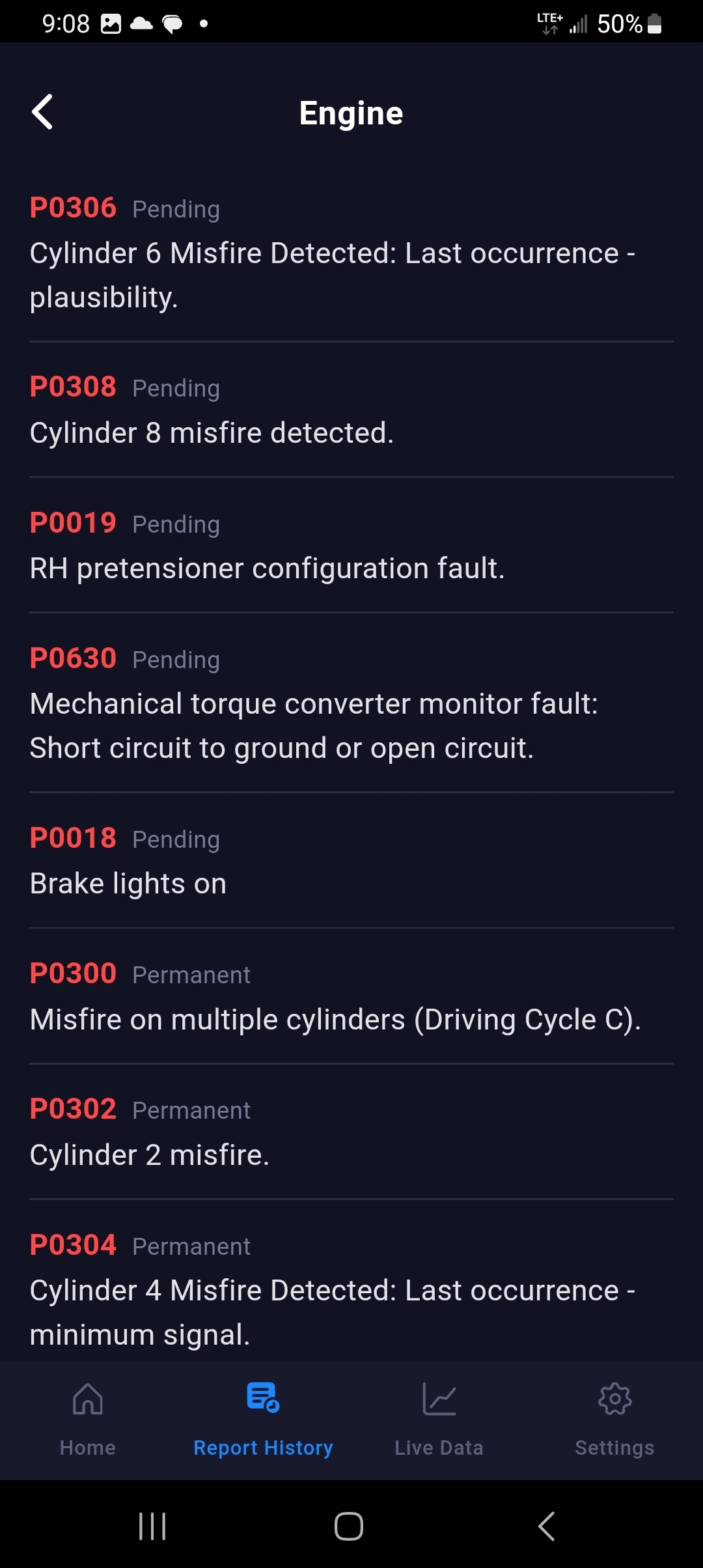 Thank you for the suggestion, Steve. So, I went and bought a simple code reader that allows me to erase codes when done with a report. After a few reads that gave a few different codes in addition to the same ones, i drove the vehicle to create a new drive cycle. On the first read the. Rover showed 4 instead of 8 cylinders misfiring. 302 to 308, all even number ones on drivers' side of engine. 304 and 306 read differently than 302 and 308 (attaching pic of report), i also Got a 0300 and 0316 code and poo18 p0019 and 06xx code too. The report mentions codes in order as stored, pending, permanent. It appears permanent are a few codes less than the other groups. I'm confused about it all. Two real time occurrences starting and driving. Engine turns over, but stalls when rpms lower to idle. Will stay cranked if the RPMs revved over 1,000. Shifting to drive from neutral with RPMs revved up at 2000 vehicle rpms drops almost to stall, does its shake, rumble and groaning then picks up movement and speed. Shifts maybe 3 or 4 times with speed topping at 50ish teetering back and forth on another shift depending on if I had a tail wind to push me past 55mph. On the first few shifts in momentum vehicle shifted slower if I pressed harder on gas pedal vs. more lightly. I went to get a loaner fuel pressure tester but counter guy said there's to fuel pumps. One behind head call a high-pressure pump that reader wouldn't work on saying he thought from vehicle current performance description I gave that would be a more probable target than fuel tank pump which pressure tester will Guage pressure on. I'm not sure what to do now. He kind of talked me out of my reason for going there but afterwards thought I should probably check it anyways because his opinion Doesn't make it fact on my vehicle because his Mini Cooper experienced that scenario. Even it's more probable than possible, I kind of feel like I should still check fuel pressure to rule in or out on tank pump that pressure tester tests.