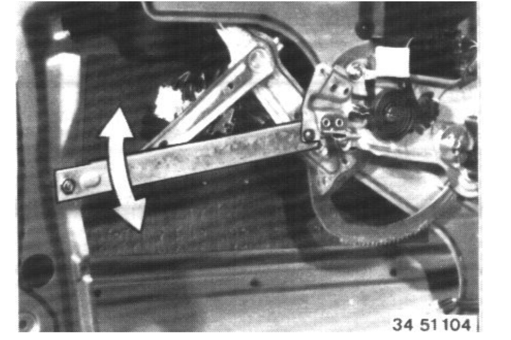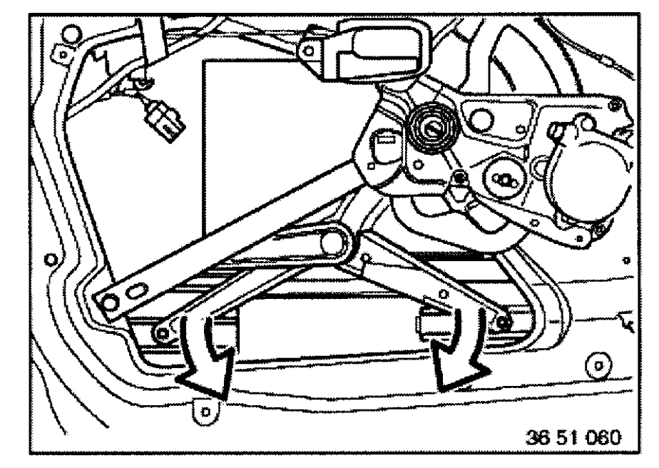 Thought had bad motor. Window loose. Took panel off. Found screw between regulator arm. Motor good. One of tracks laying in bottom of door. Need to regulate but don't know exactly how far from edge of window.