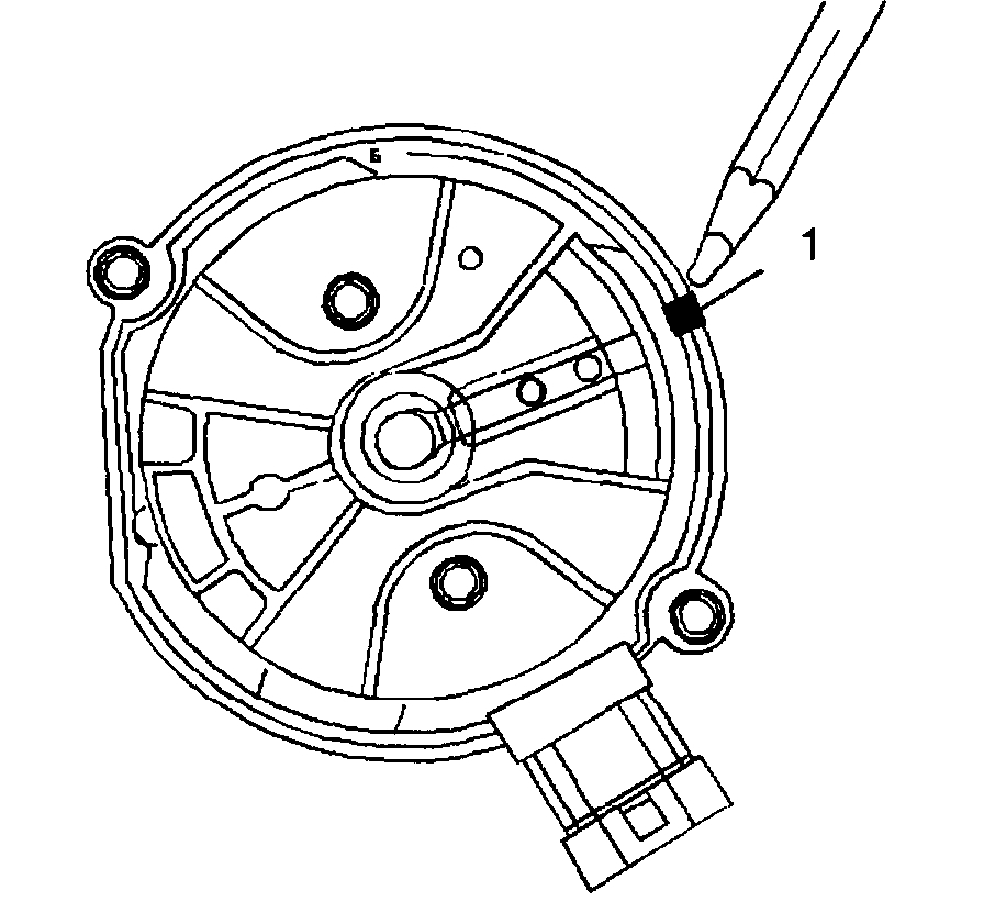 7. Once the distributor is completely seated, the rotor segment should be aligned with the mark on the distributor base (1).
