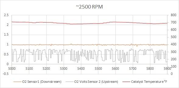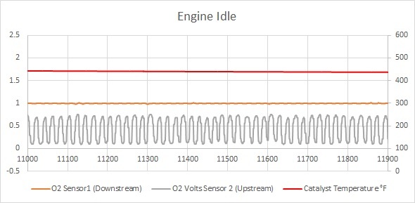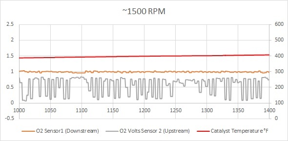 I am trying to determine whether a new converter is necessary. If you look at the images below, you will see that at idle, 1500 rpm and 2500 rpm the upstream O2 sensor is describing a nice waveform that averages about 0.45 volts. In the same instances, the downstream sensor is showing a relatively flat line around 1 volt. This is indicating a properly functioning catalyst.