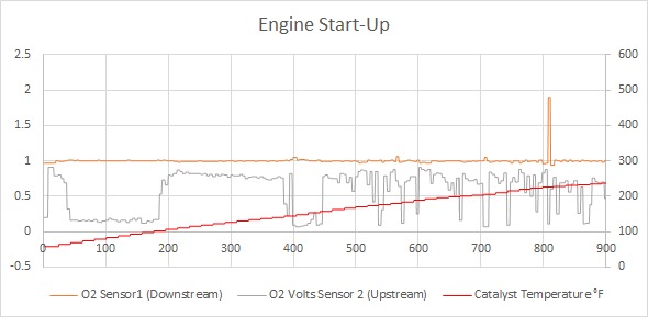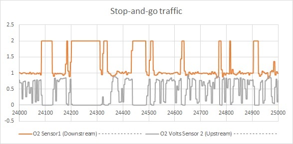 On the other hand, the last two images seem to suggest a broken downstream sensor. I recorded data on engine start up. The strange thing about this data is that the downstream sensor is showing a flat line even though the converter is less than 300 degrees. The downstream sensor should mimic the upstream sensor when the converter is at these low temperatures. Also, when the vehicle is in stop and go traffic, the downstream sensor is showing a lot of noise. I'm not sure what explains the pattern in the last image. The downstream appears to be moving in an inverse fashion with respect to the upstream sensor.