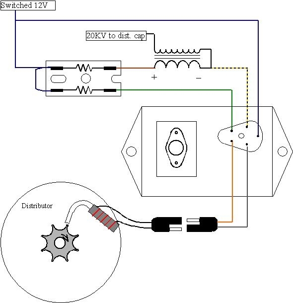 Here's a diagram of the ignition circuit. Chrysler has always been the leader in innovations that benefited car owners, and this is one of them. This was the world's first electronic ignition system in 1972 on Dodges and 1973 on Chryslers and Plymouths. If you see that odd-shaped plug with five wires, that is indeed the ignition module. The color of the housing denotes the maximum rpm it will work to, but for normal use, they all work the same. By the time you get to around 1980 models, they used the same five-pin module, but there will be only four wires used in the plug.