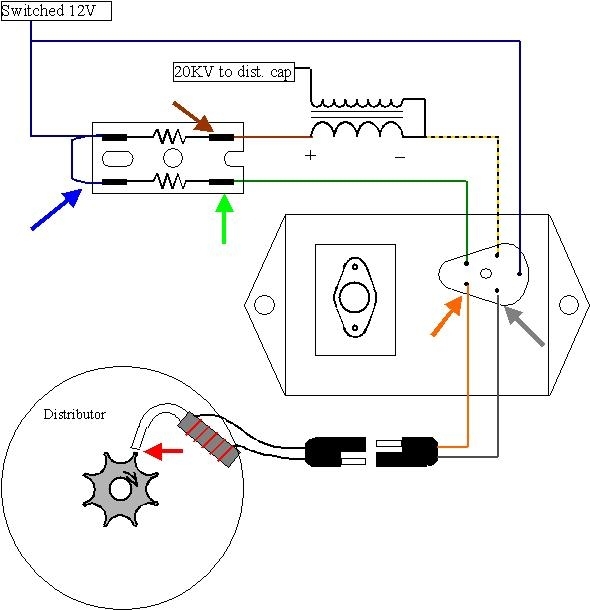 By far the most common problem was the dual ballast resistor. They often failed while the engine was idling for a long time, as at a stop light. Many people carried spares in the glove box. Check for 12 volts on the blue wire, (blue arrow), the brown wire, (brown arrow), and the green wire, (uhm, . . . green arrow). If it's missing on the brown or green wire, replace the resistor. The half that burns out is bypassed during cranking, just like we did for decades before, to make up for the low battery voltage during cranking, to develop a stronger spark for easier starting. Because of that bypass, the symptom will be the engine starts and runs as long as you hold the ignition switch in the "crank" position. As soon as you let go of it and let it return to the "run" position, the engine will stall.