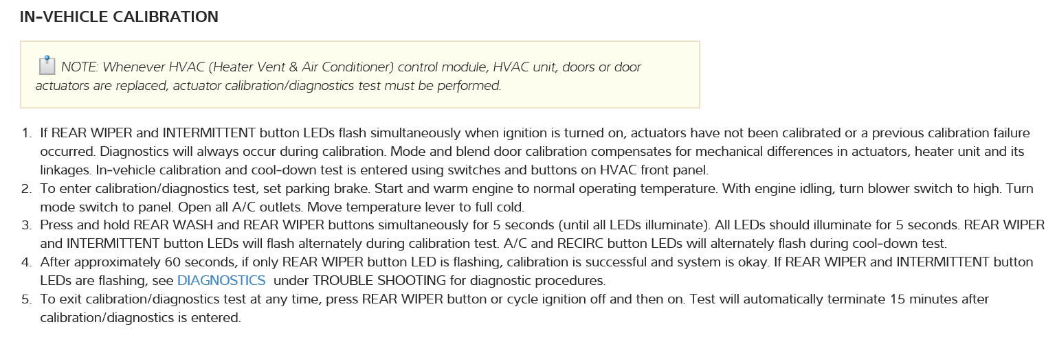 Calibration Test is running when rear wiper and intermittent are alternately. flashing. Cool down test is running if A/C and RECIRC are alternately flashing.