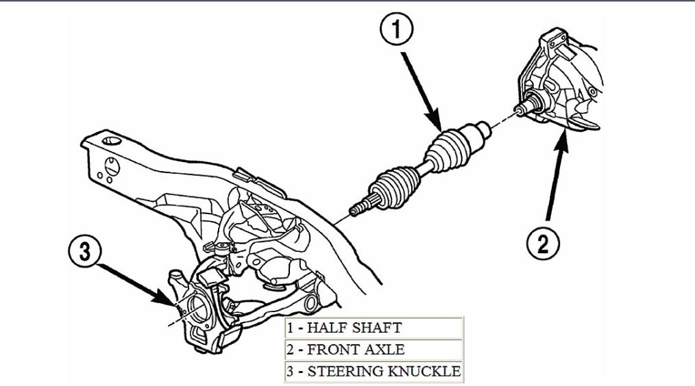 The axle receives power from the transfer case through the front propeller shaft. The front propeller shaft is connected to the pinion gear, which rotates the differential through the gear mesh with the ring gear bolted to the differential case. The engine power is transmitted to the axle shafts through the pinion mate and side gears. The side gears are splined to the axle shafts.