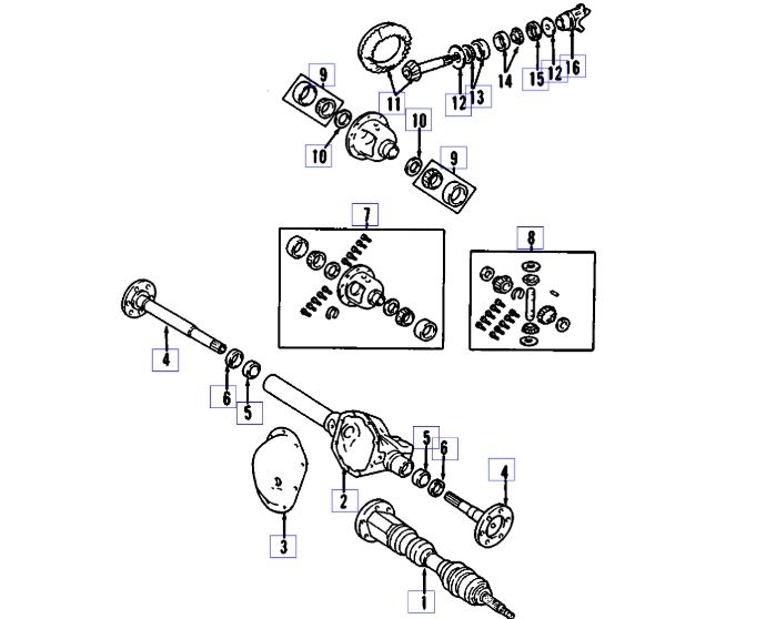 The differential case is a one-piece design. The differential pinion mate shaft is retained with a rollpin. Differential bearing preload and ring gear backlash is adjusted by the use of select shims. The shims are located between the differential bearing cups and the axle housing. Pinion bearing preload is set and maintained by the use of a collapsible spacer. The differential cover provides a means for inspection and service.