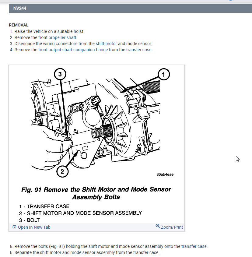 Separate the shift motor and mode sensor assembly (2) from the transfer case (1).