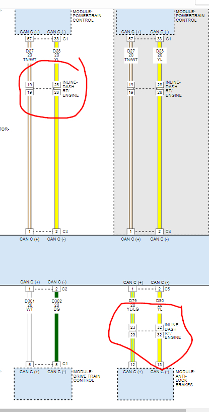However, before you get to far, you will want to go the inline connector that I circled. It is on the passenger side wheel well close to the PCM. I have seen quite a few of these have water intrusion causing these types of issues. You may have to look close but you will see some of the terminals green with water intrusion. All of these codes go through this connector so I suspect this is your issue. If you find an issue, you can go to a dealer and they can order connectors for you so you don't need to replace the entire harnesses. You just need to tell them you need the connector kits for the I230 connector. The part numbers should be 68080570AA and 68080569AA but just have them double check that to be sure.