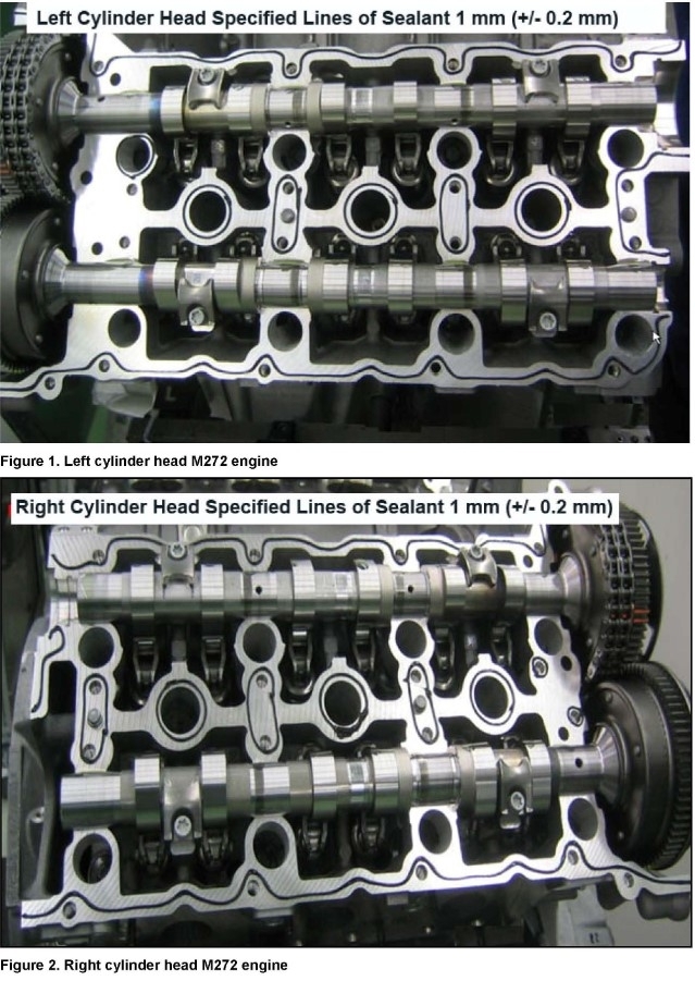 The new generation of Mercedes-Benz engines have chemical sealers (sometimes referred to as "formed-in-place gaskets") applied to sealing surfaces by robots during the engine assembly process. This engine sealing technique called the RTV (Room Temperature Vulcanizing) uses the silicone rubber compound. This precise and uniform application of silicone at the factory insures proper adhesion and a leak tight connection that very rarely leaks.