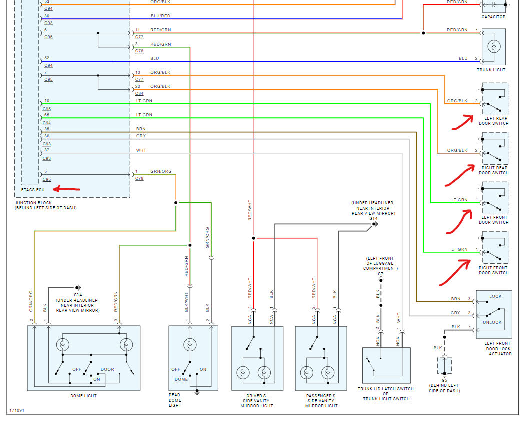 Also, do all interior lights stay on or is it limited to one? Note: The front, rear, and trunk lights have a common power supply, so I'm trying to narrow things down.