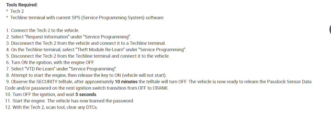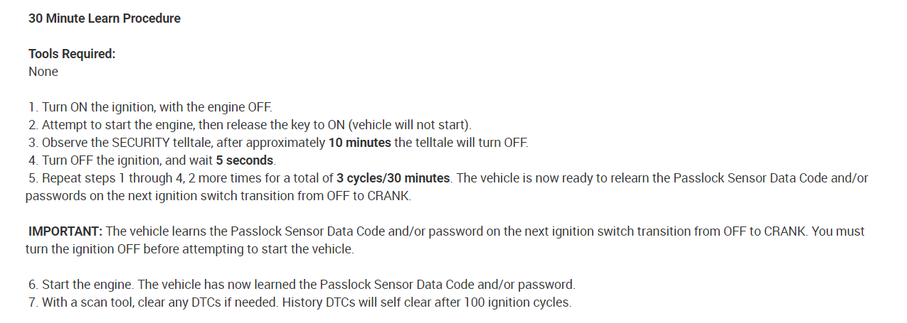 There is a 10 minute relearn procedure that requires a scan tool. There is also a 30 minute that does not require a scan tool.