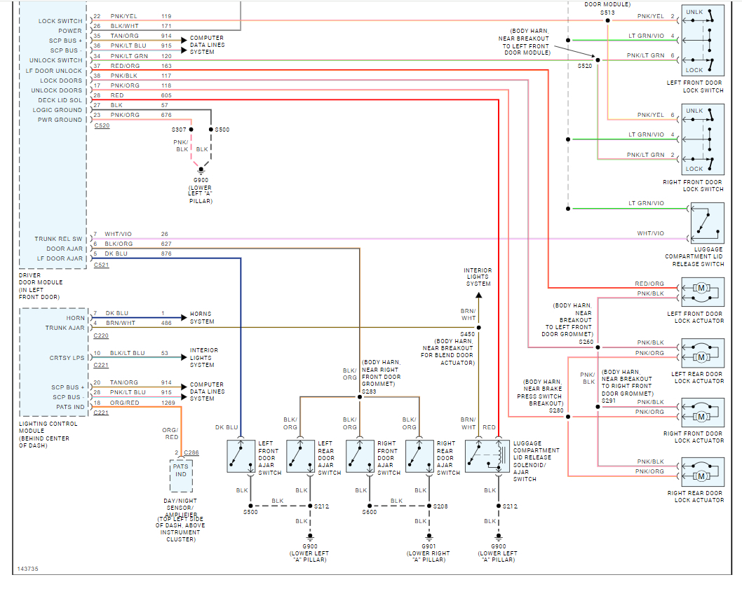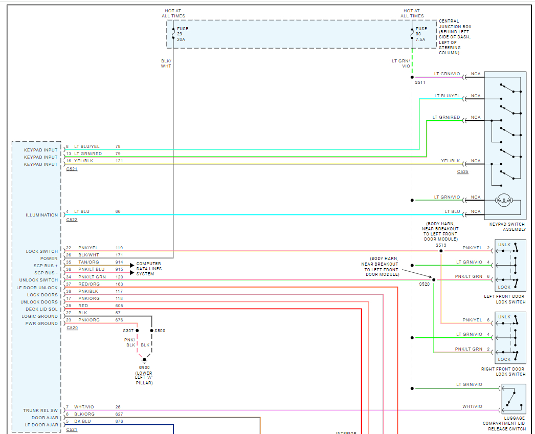 Doors will not unlock with door switch but will with key fob. Also, the keyless entry does not work, switch has voltage and check good.