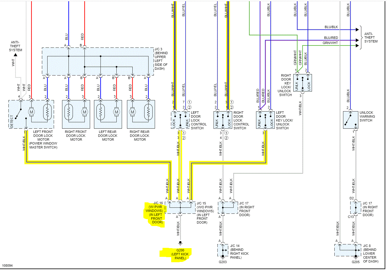 With that being said, since you are having trouble with both windows and locks, I suspect the switch has failed. However, before jumping to conclusions, I need you to check the ground (black wire with white tracer), behind the left kick panel. I have a feeling it has failed.