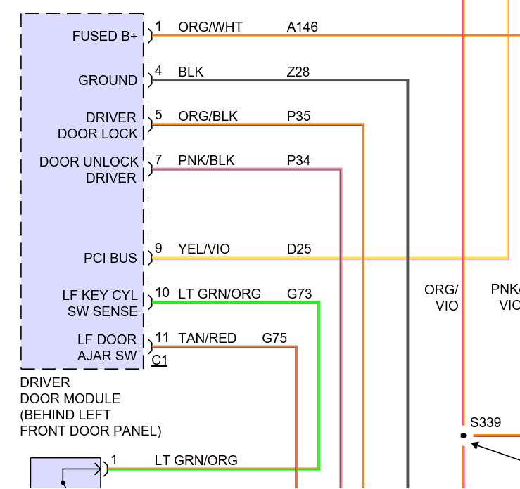 The chassis portion of the harness, which plugs into to door harness was what i was after.with what you sent I can "make the connection" hopefully by matching wires on the mating connectors. The big problem is the wire break in the door jamb from constant bending. I was replacing the wiring and reducing the bending by creating wire space an less restriction to movement. Something difficult to comprehend with modules, is how the passenger side lock/unlock function can operate the drivers door, while the driver door cannot perform this on the rest of the doors apparently on the same wires (as i can discern) if i have any broken wires remaining. I will have to get to a failure mode, open the door panel and trace wires from the color code provided to the point where i reconnected to the main vehicle harness, to verify wiring. After that, I'm agian lost if continuity exists. I can work from the diagram you provided, unless you have the chassis diagram at the driver's door connection. The pic i sent was the plug and wire colors of that harness. Apologize this is so confusing, been chasing this for a while. Dealerships are not of much help as service writers are not technicians and they do not let you explain needs to the person doing the work. I tend to use independents due to this.