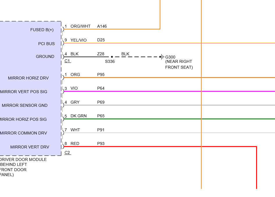 what I sent was for power door locks but this one is for power mirrors so if you have windows that are power they may all lead to same and you SHOULD let us know which is whichlike if yo uhave windows, mirrors etc as they may go to same module but are all broken down separately in manuals. At least in ours so as to not be confusing. so this one is for mirrors.as you will see goes to door module.