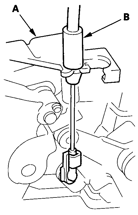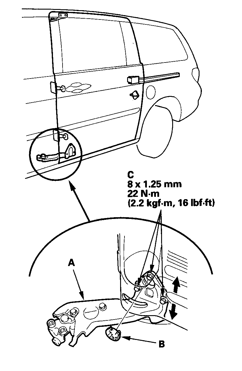 2. Adjust the cable bracket (A) so that the measurement (B) is 34 mm (1.34 in.) at the other end of the cable including the latch free play, then tighten the bolt (C).