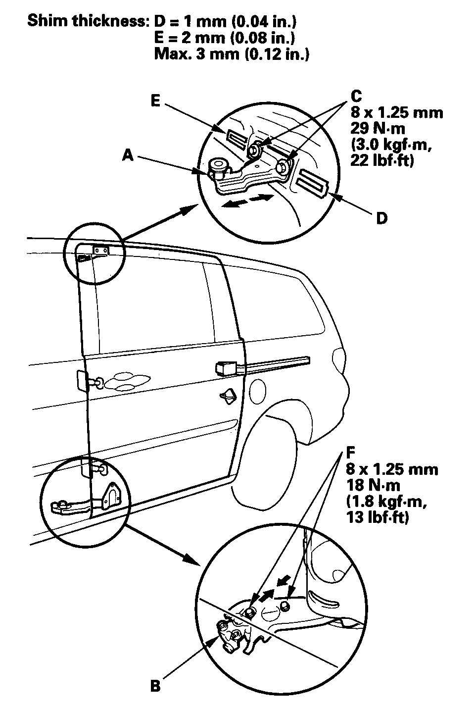 1. Slightly loosen the upper roller bolts (C), and install the shim(s) (D, E) between the upper roller and the door until the door is flush with the body.