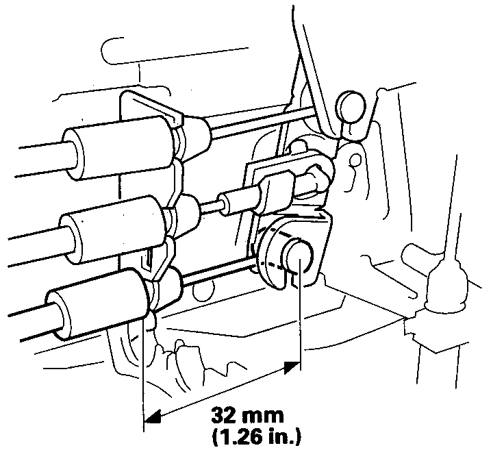 3. After the front latch assembly is installed on the door and the front latch cable is connected to the remote control assembly, confirm that the measurement is still 32 mm (1.26 in.).