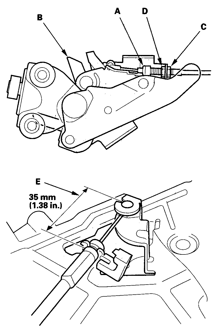 3. While the lower roller latch assembly is in the closed position, set the adjusting nut so that the measurement (E) is 35 mm (1.38 in.) at the other end of the cable including the latch free play, and then tighten the locknut.