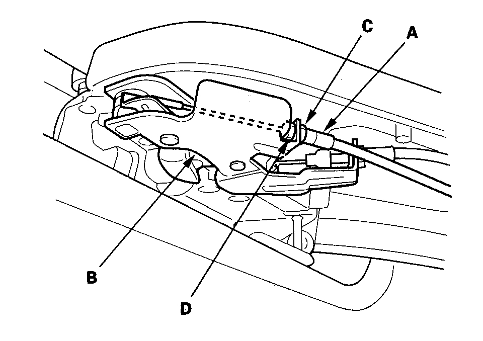1. Position the end of the cable (A) in the lower roller latch assembly (B) keeping the locknut (C) and the adjusting nut (D) loose. Make sure the window is fully closed.