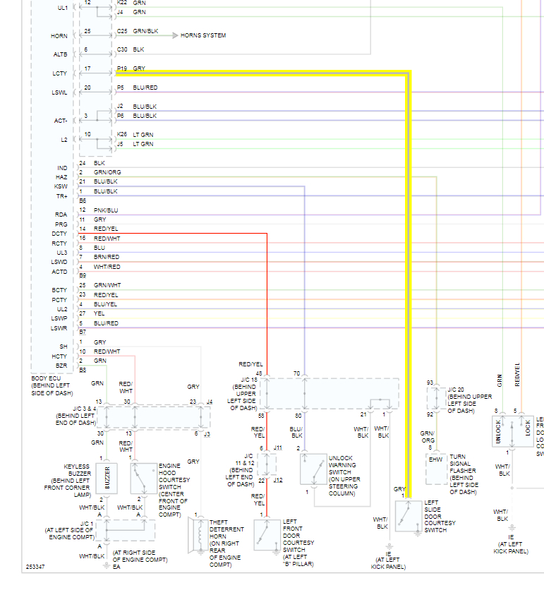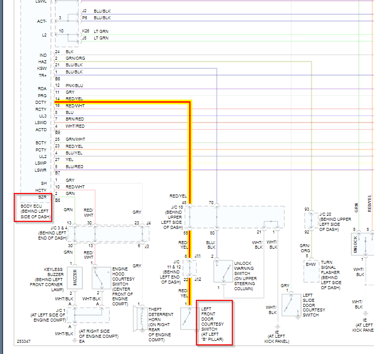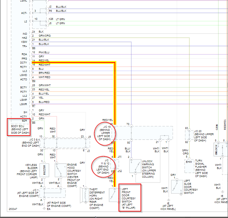 So what we need to do is go to the body computer and test the inputs from the sensors to see if they are getting voltage. These are simple open closed switches. So if there is voltage on the circuit at the body computer then the switch is closed telling the BCM that the door is open. This is not a typical voltage test because the switch closes to provide ground so if you test this by putting one lead on the wire and the other on the ground then you will get voltage and think the switch is the issue. So you need to use a test light or a voltmeter and put one lead on battery positive and the other on the wire because you want to see if the switch is providing ground when the door is closed.