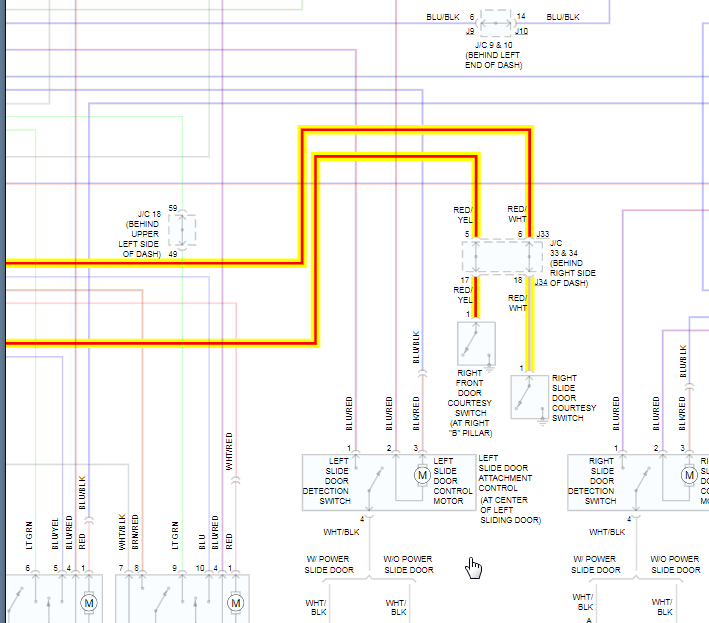 The junction blocks are circled and if when the door is open there is no voltage then you have an open circuit somewhere. It could be one of these junction blocks but we need to test voltage going in and out and I bet they did not test it correctly as these are just pass through parts and are not common to fail. Even if they are, I would just bypass it with new wiring and not replace the entire component as it is not needed.