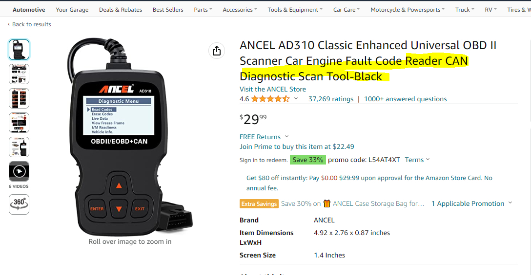 Also, if we have an ABS light, it could be any of the wheel speed sensors. As far as a scan tool, you can get them for not too much money. I attached a pic below to show you. That is from Amazon. What it is capable of I can't say, but it indicates CAN capabilities. And yes, our scanner cost $5,000.00, but it does everything except wash the windows. LOL