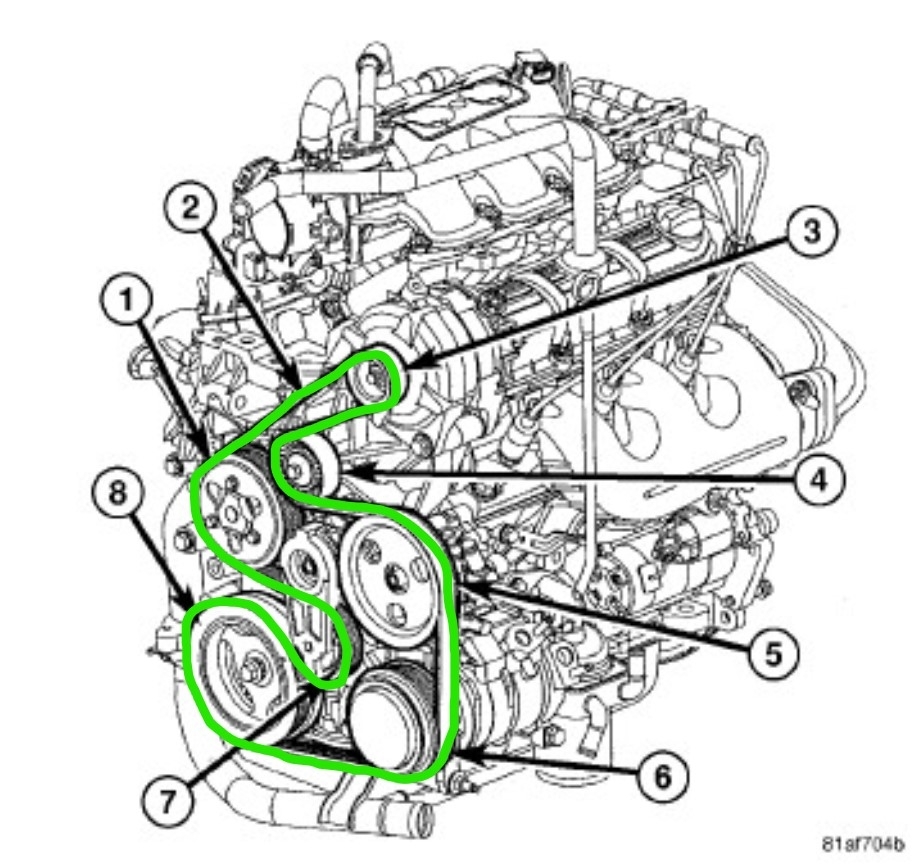 The belt route is a bit convoluted, but it doesn't wrap any of them twice. I highlighted it in the image because of that. Route the belt over all the pulleys except the crankshaft, then move the tensioner and put the belt onto the crankshaft pulley. Then put the plastic shroud back in place.