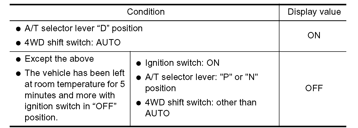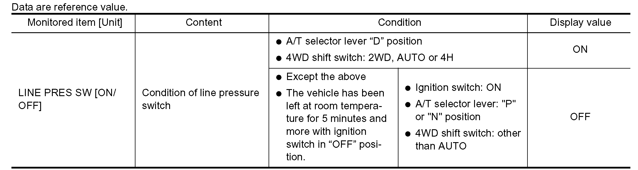 3. Read out ON/OFF switching action of LINE PRES SW while operating 4WD shift switch.