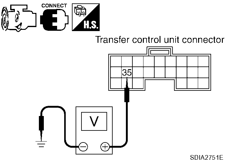 2. Check voltage between transfer control unit harness connector terminals and ground.