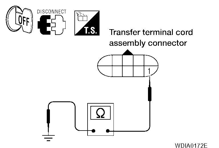 3. Check continuity between transfer control unit harness connector E143 terminal 35 and transfer terminal cord assembly harness connector F56 terminal 1.