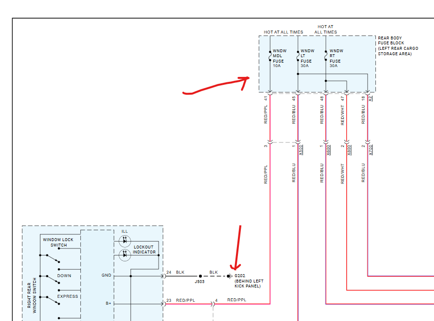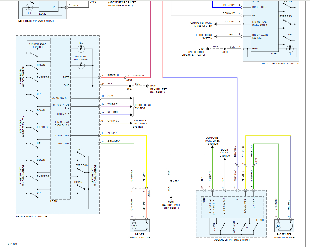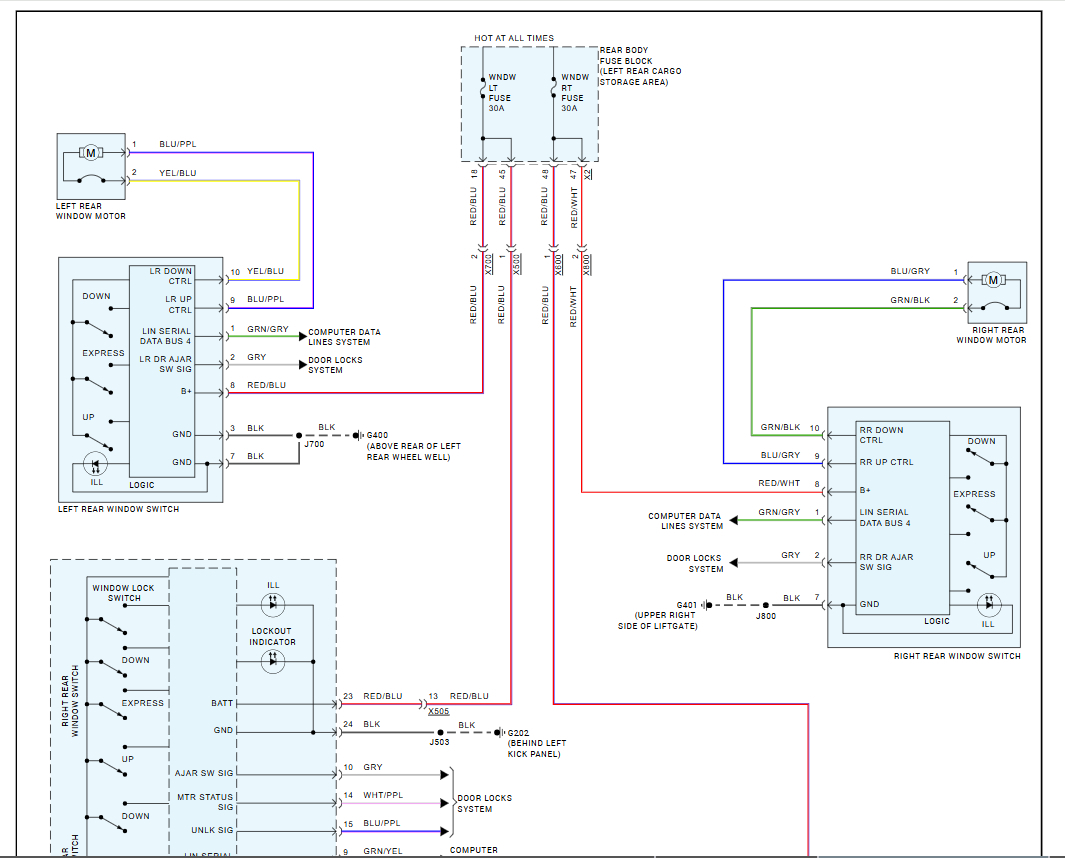 Thank You for your assistance and the wiring diagrams. Well the window switch is finally working and I'm not sure what fixed it, lol. After I got the last diagram, I went back and started double checking the wiring. I decided to run another obd reader test and see if any of my code have changed. Lo and behold they had. I got none of the previous codes and had 5 totally different codes. The first code said I had low voltage to my BCM module, and the other four are for the tire air sensors ( which need to be replaced). But the BCM low voltage was bothering me, lol. So I stared checking with my volt meter for voltage readings. After screwing around with that for awhile, I went back and checked all fuses front and back again. While under the hood I noticed that my negative terminal on the battery was slightly corroded, so I pulled it off and cleaned it real good. I threw everything back together for the twentieth time, turned the car on and much to my surprise the windows worked. I ran obd diagnostics again and the low voltage code was gone. So while I am thinking it may have been a combination of the master door switch and the "low voltage" , I am not sure what caused the problem, but am extremely happy it is fixed. Thanks again for all of your assistance.