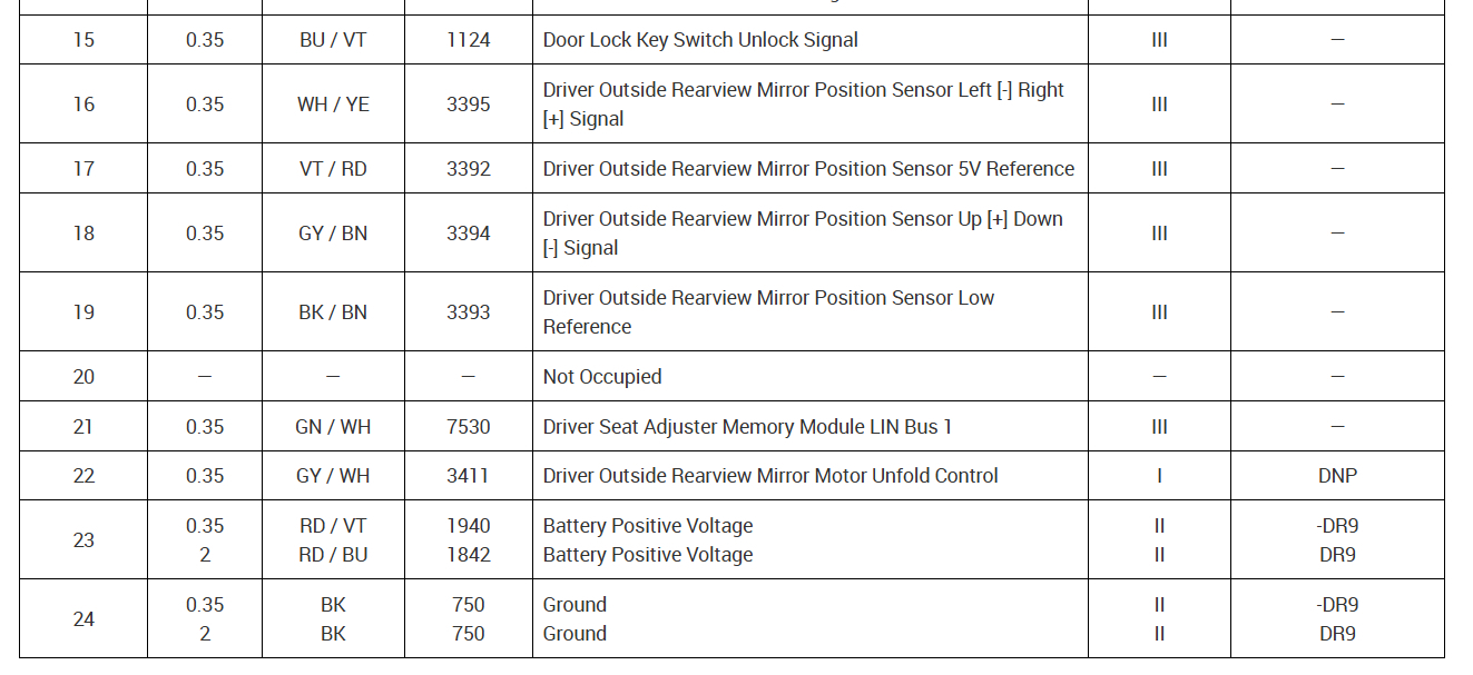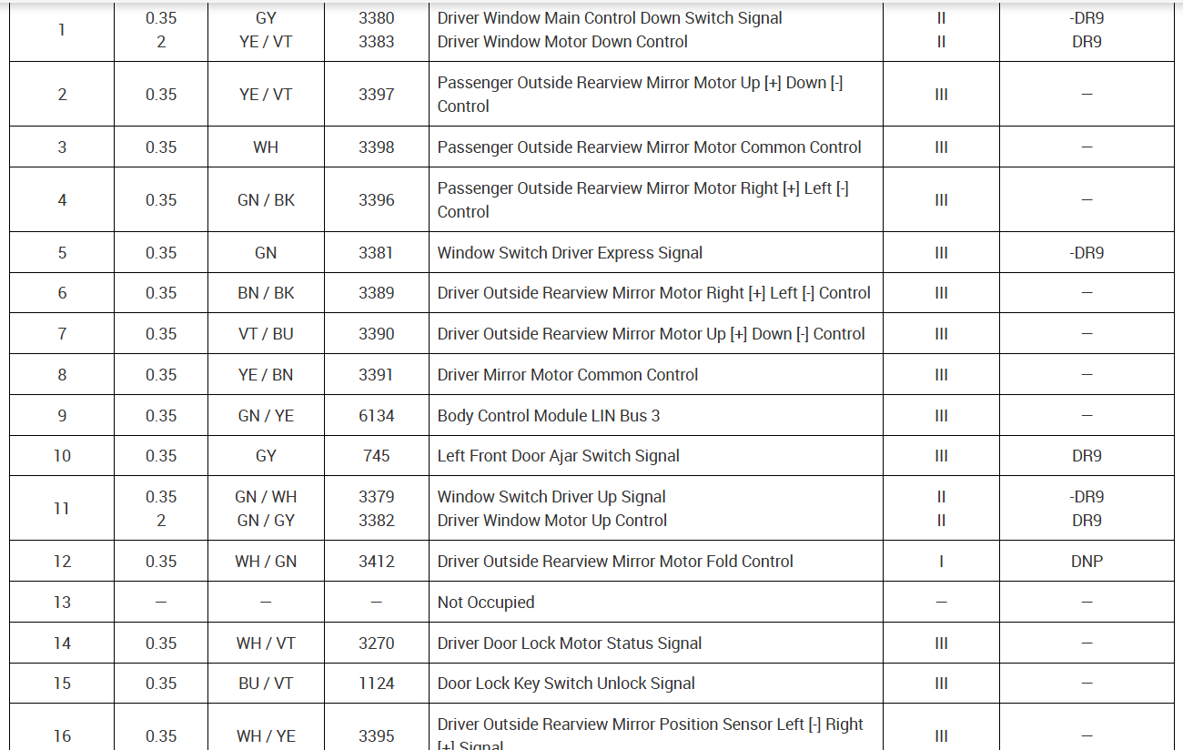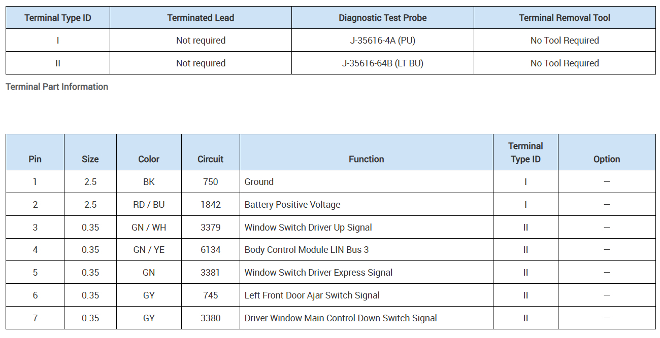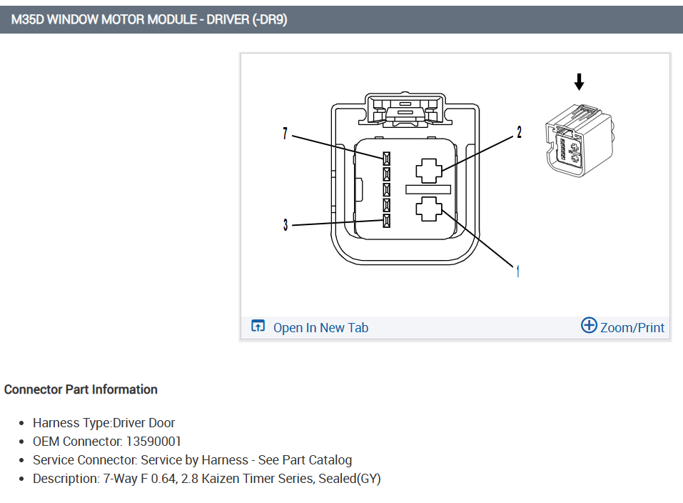 Thank you for the pinout for the window switch, is there anyway to ge a full wiring diagram including the window switch circuit board? I was testing the switch circuit board and saw multiple voltages at different points on the board. So my question is how to bypass the switch circuit board and test the window motor itself? The voltage on pins 1 and 2 is 12V, is the voltage on pins 3 & 7 also 12 volts? If I bypass the switch and apply 12V to pins 1 and 2 will the motor operate? or do I also have to apply a voltage across pins 3 and 7? without a full wiring diagram and knowing how the 3 & 7 pins affect the motor operation I am not sure how to test motor. I do not want to apply 12v to a 3 or 5 volt section of the motor control board and cause another problem.