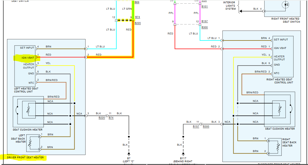 I know where the seat control unit is. I need to know where the other modules are located so that I can unplug them, one at a time to see if the light on the switch illuminates.