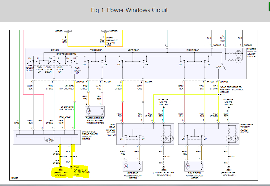 This could be a problem with Grounds #300, 301. They are on the left "B" pillar behind the trim and behind the left kick panel, respectively. In the diagrams down below I have included a wiring diagram of your vehicle's power window circuits and a guide on how to check grounds properly. Please check these grounds and get back to us with what you are able to find out.