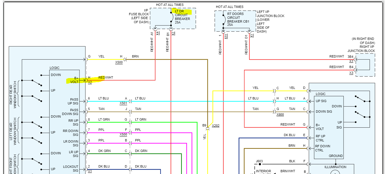 The left door has a separate circuit breaker. See pic below. At the main switch, there will be a red wire with a white tracer. Check to see if it has power (12v). Note: The circuit breaker is located in the interior fuse box on the left-hand side of the dash.