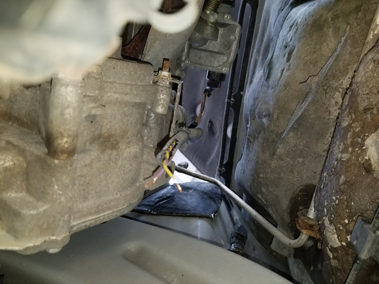 The transmission output speed sensor is located on the passenger side, the back side of the transmission, near the firewall, above the right drive axle, and can be reached from beneath or from above. The connector has one release tab and is very water tight. The wire colors are violet and yellow. They connect to the engine control module (ECM). When the sensor is defective, this causes a P0722 code. One hex bolt and O-ring hold the VSS. Replace the O-ring if disturbed. Clean the area before removing the VSS to keep specs of dirt out.