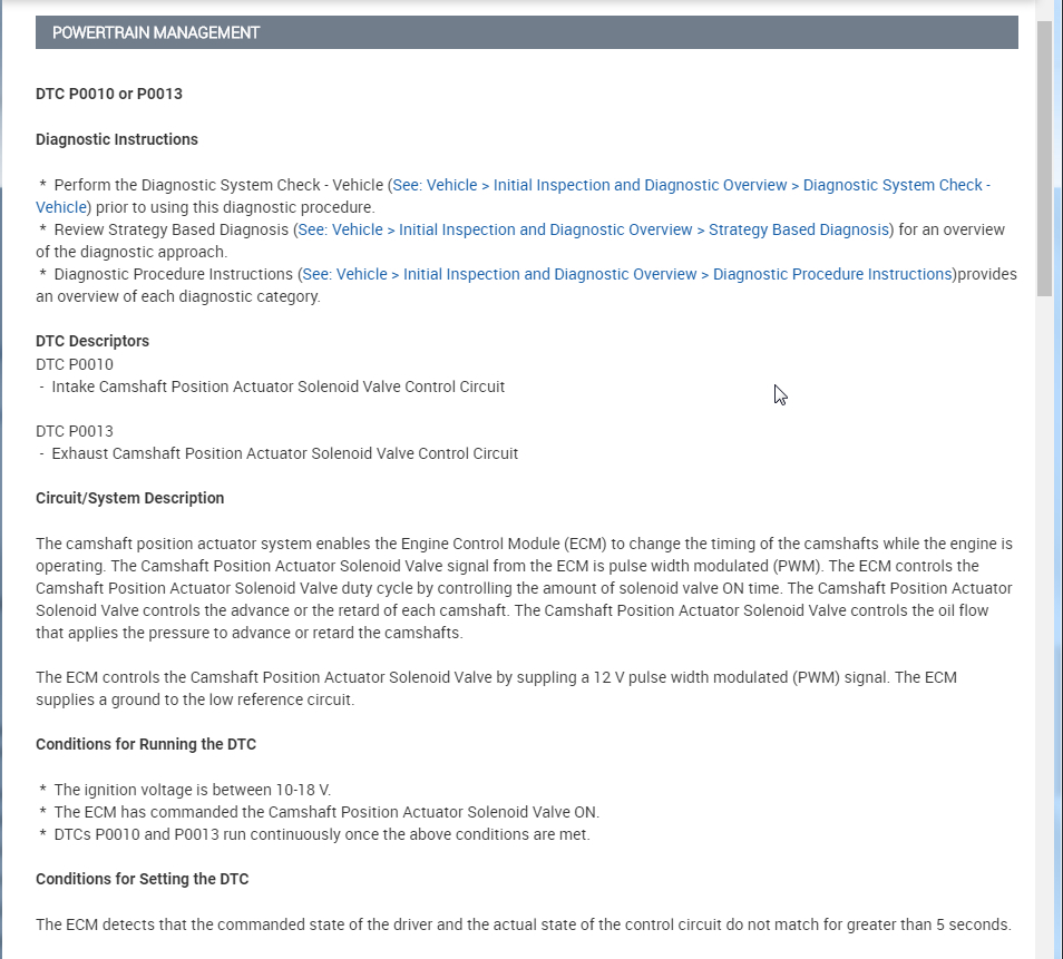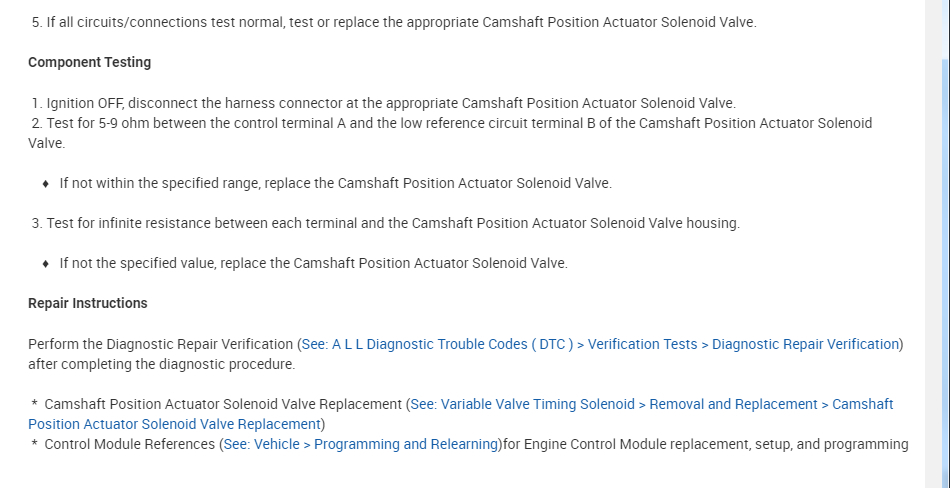 Okay. Here is the testing for this code. Basically it is saying that the ECM has an open circuit to the intake cam sensor in this case. Again, we need to follow the testing to find the issue but most likely it is a wiring or connection issue.