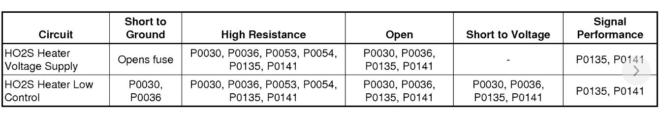 Heated oxygen sensors (HO2S) are used for fuel control and post catalyst monitoring. Each HO2S compares the oxygen content of the surrounding air with the oxygen content in the exhaust stream. The HO2S must reach operating temperature to provide an accurate voltage signal. A heating element inside the HO2S minimizes the time required for the sensor to reach operating temperature. Voltage is provided to the heater by an ignition voltage circuit through a fuse. With the engine running, ground is provided to the heater by the HO2S heater low control circuit, through a low side driver within the engine control module (ECM). The ECM uses pulse width modulation (PWM) to control the HO2S heater operation to maintain a specific HO2S operating temperature range.