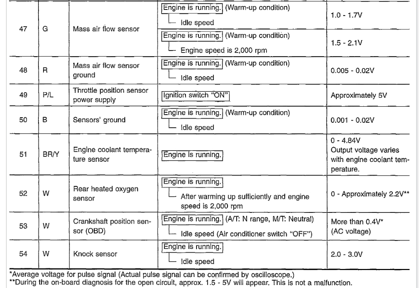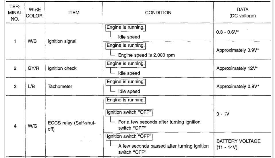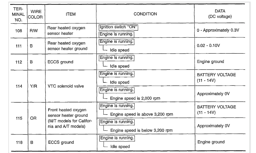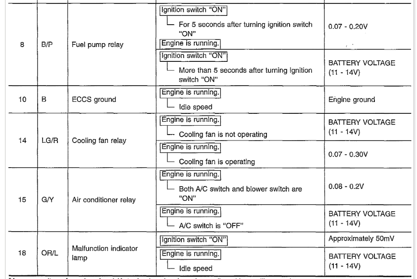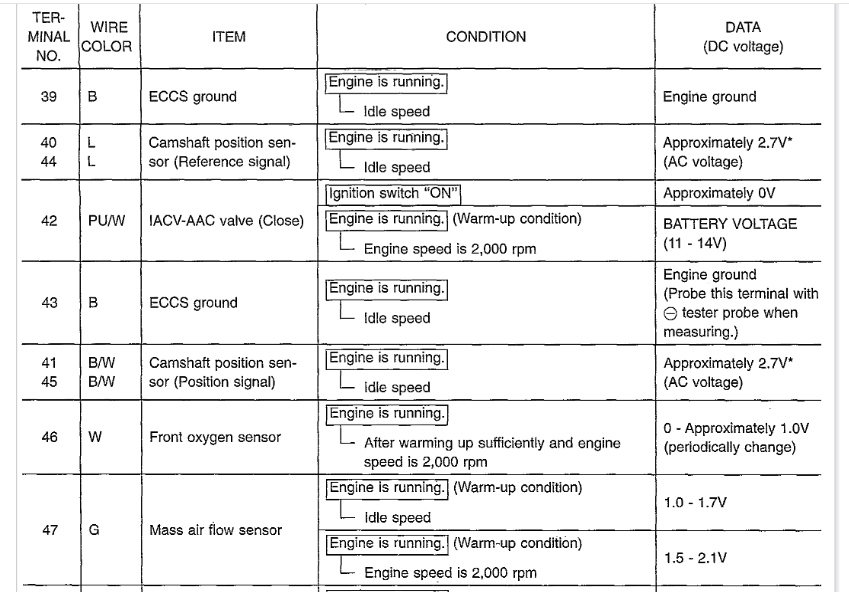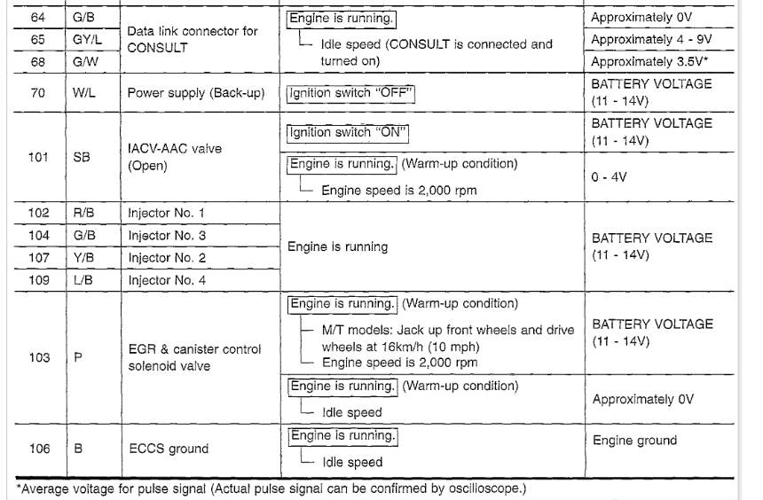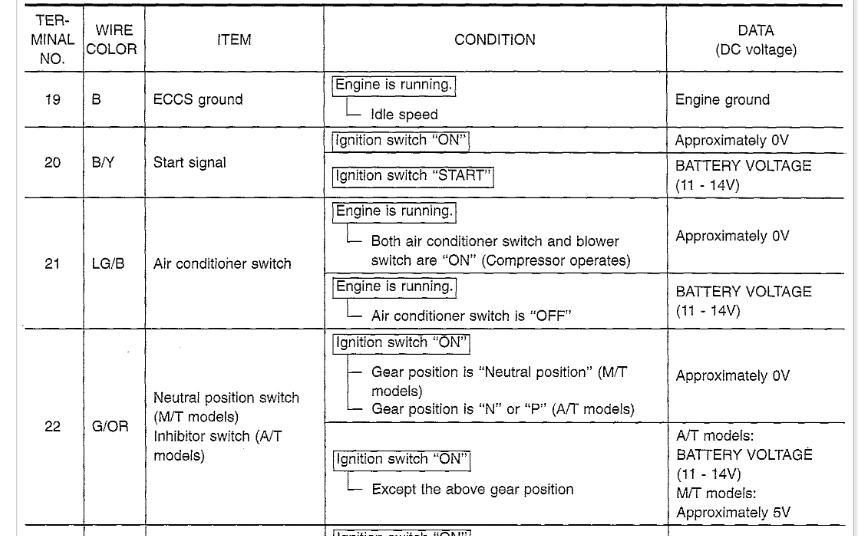 Take a look at what I attached. It is for 1996 Sentra L4-1597cc 1.6L DOHC MFI (GA16DE) It includes ECM information for either an automatic or manual transmission.