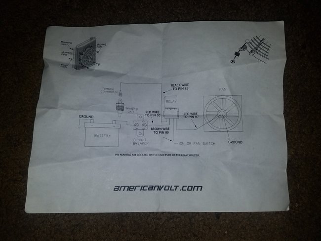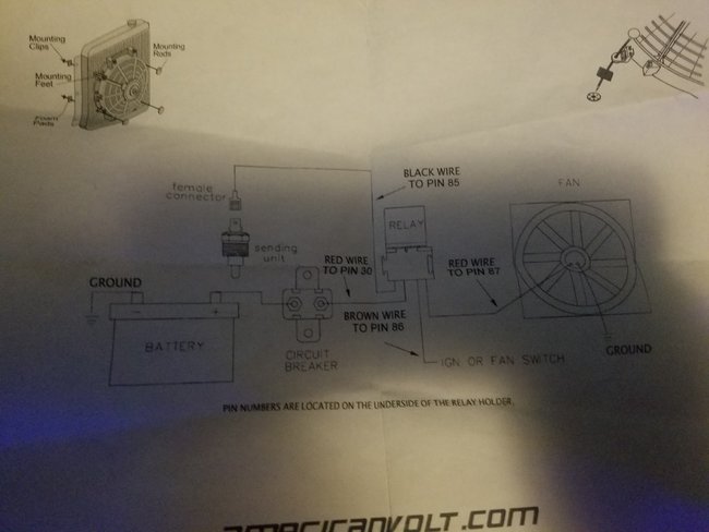 So I have almost completely wired up my electric fan kit except the wire to the fan and the wire that goes to ignition which I believe is only there for the sole purpose of telling it to turn on. I have hooked this wire to my secondary fuse box that only gets power. once the key has been turned to the on position but for it to get power it needs a fuse plugged in, but I would have no idea what amperage fuse to use. Here is a picture of the wiring diagram the circuit breaker I believe is a 35 amp. Thanks for any offered help. The brown wire to pin 86 is the one I need help with on fuse size.